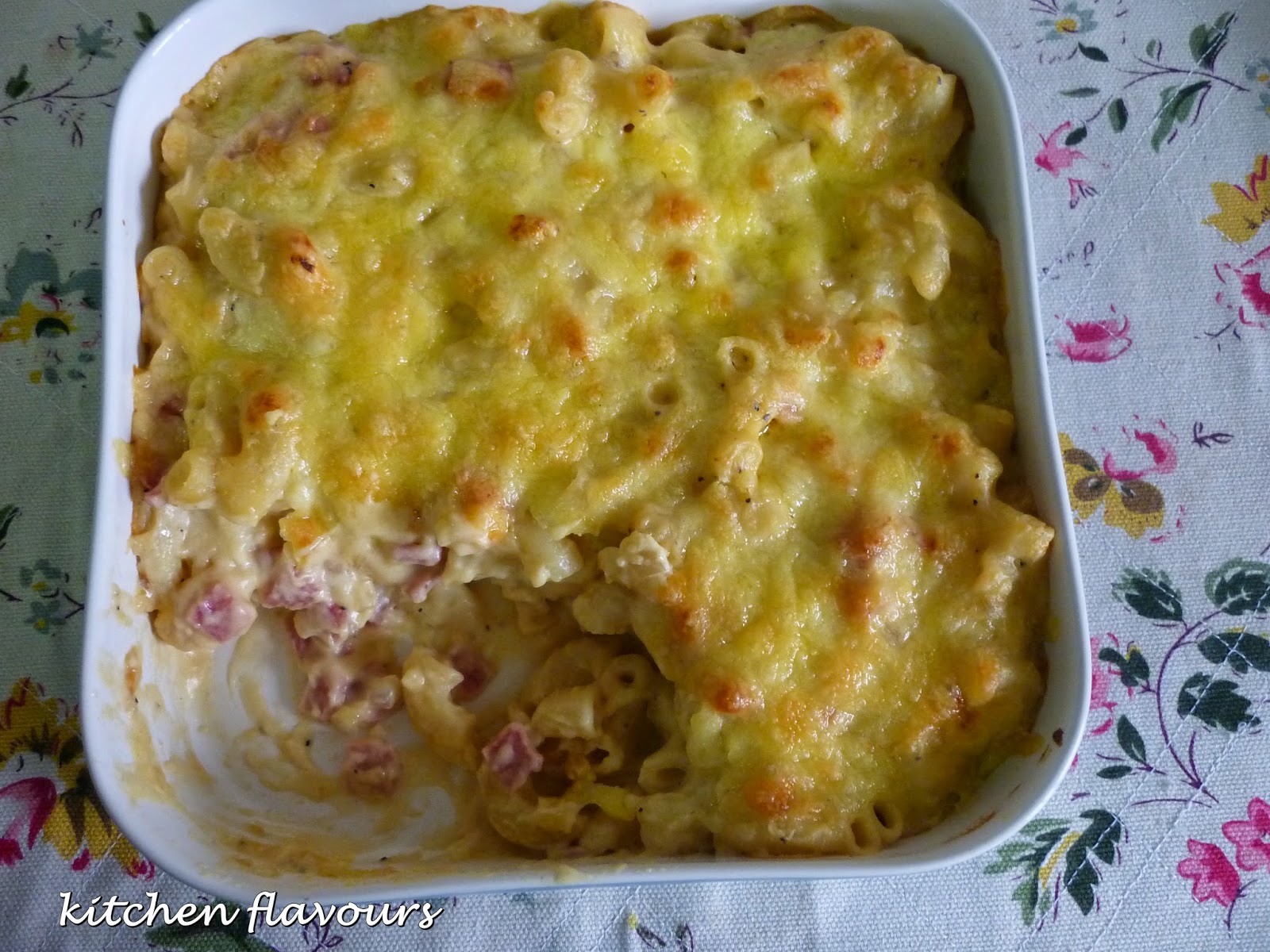 Really easy to make, I cooked the sauce, by first sauteing the chopped onions until soft, add in the chopped ham, stir for a minute, then the flour, followed by milk, adding it gradually while whisking all the time. Add the mustard, and most of the cheese, whisking till the cheese are melted. Season with salt and pepper and I added a little more of the mustard, to taste, as we love mustard. Boil the pasta just until al dente, toss them together with sauce and transfer to a baking dish. About 30 minutes before eating, I scattered some cheese, which I've used a mixture of grated Cheddar and Mozzarella, bake in a preheated oven for about 25-30 minutes until golden and bubbling. Let stand for 5 minutes, then serve while still warm.